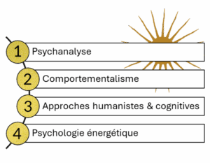 La psychologie s’est enrichie au fil du temps : de la psychanalyse de Freud et Jung, centrée sur l’inconscient (1ère vague), au comportementalisme de Skinner et Wolpe, axé sur le reconditionnement (2ème vague), puis aux approches humanistes et cognitives d’Ellis, Beck et Rogers, qui valorisent le potentiel humain et la conscience des pensées (3ème vague).